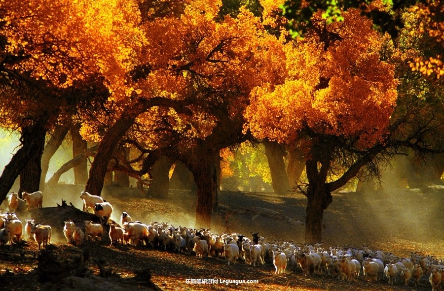 六道桥:有大片无边无尽的胡杨叶子,偶尔能看到彪悍的蒙古人骑着高大的骆驼穿行其间,偶尔还有羊群经过时扬起的烟尘在光影里面跳跃。