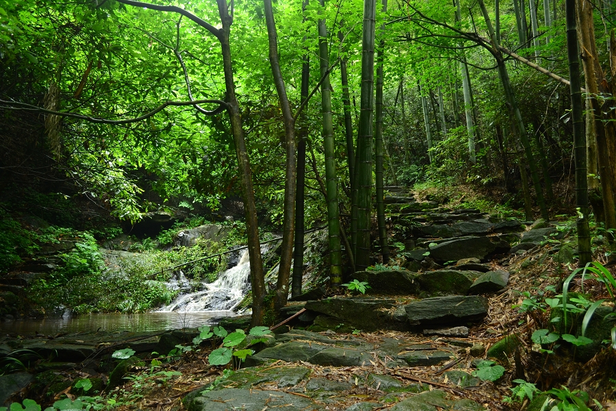 幽静的林荫小道,沿小溪而上,山路弯弯、流泉飞瀑、枝红叶黄、景色斑斓