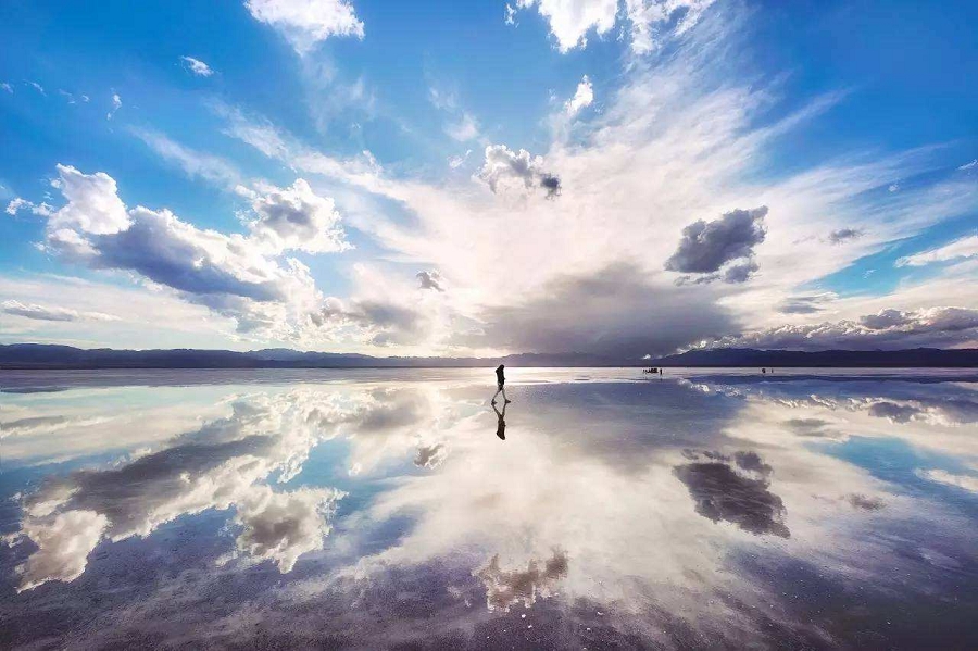 茶卡盐湖也叫茶卡或达布逊淖尔,“茶卡”是藏语,意即盐池,也就是青盐的海;“达布逊淖尔”是蒙古语,也是盐湖之意。在这里,湖天已经没有界限,天地辽阔,一如我的胸膛,任何热爱你的人,都可以在纯净的天空自由行走,感悟你的大美和空灵